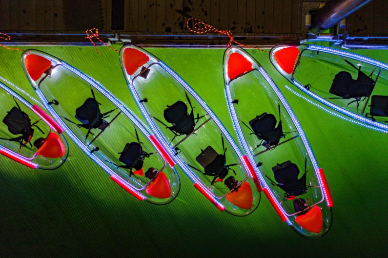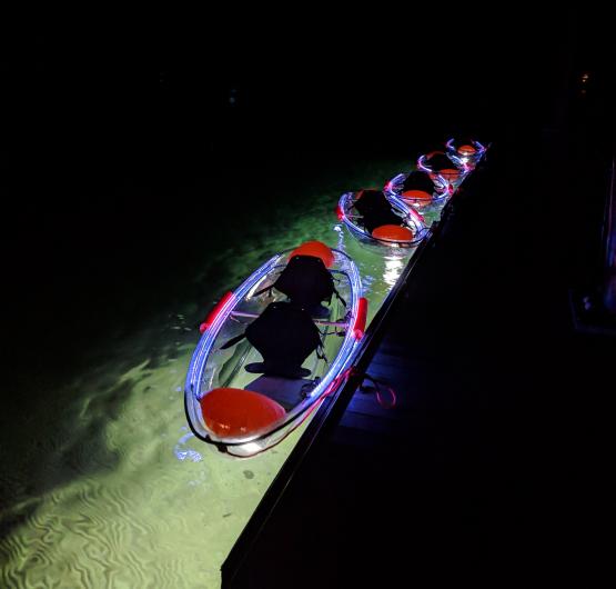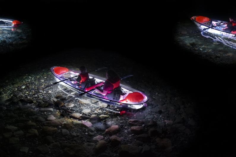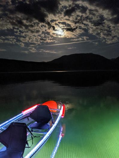 Imagine you are at 4372 feet elevation on a glacier formed lake with a mirror surface of the night sky and complete darkness with only the stars and moon lighting your way. JO Paddle creates a magical night by lighting up translucent kayaks with LED lights and an extra 600 Wt flood light to peer beneath the surface; giving you a glimpse of the over 300 feet deep lake. Learn fun new facts about the area including stories of the Wallowa Lake Monster ``Wallie" and great places to hike and eat in Wallowa County.